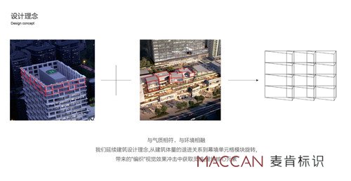 設計師通過簡練的線條和充滿創(chuàng)意的結構創(chuàng)造,將建筑及景觀、空間的語言轉化到標識系統(tǒng);用提煉的元素重疊旋轉及錯位關系反映在標識牌上與氣質相符, 與環(huán)境相融;麥肯延續(xù)海境界建筑設計理念,從建筑體量的退進關系到幕墻單元格模塊旋轉,帶來的"編織"視覺效果沖擊中獲取靈感,提煉核心元素,使其環(huán)境標識牌與建筑遙相呼應,賦予來訪者一個關于頂級人居生活場所的絕佳審美期待 。